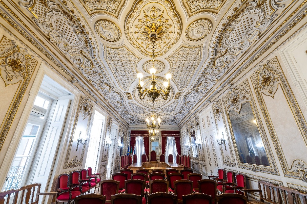 Na antiga sala de jantar do palácio, atual sala das sessões, destaca-se no teto, nos panos laterais, cartelas de concheados a que se sobrepõem cartelas de enrolamentos flamengos com as iniciais entrelaçadas do nome do proprietário, Manuel António da Ponte – “MAP” –, sustentadas por meninos aos pares.